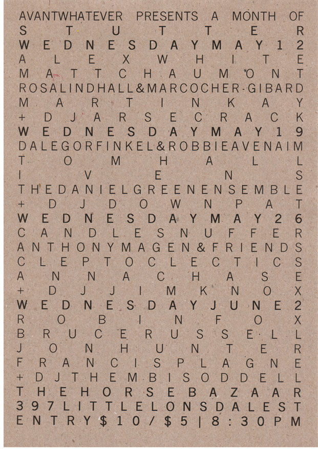 Avantwhatever curated a month of nights as part of Stutter at Horse Bazaar.
